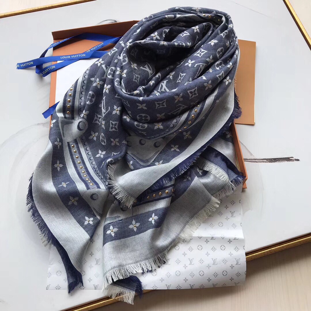 - 60% silk, 40% wool- Allover Monogram jacquard weave- Louis Vuitton signature- Gold-color metal studs - Fringe finish - Dry clean onlySize: 56.1 x 56.1 inchesComes with Louis Vuitton serial number, dust bag, authenticity card and box.