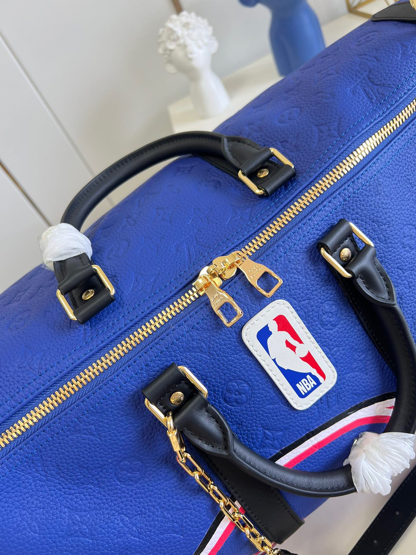 This Keepall Bandoulière 55 travel bag sports the colors of the NBA. Vivid blue Taurillon leather, embossed with the Monogram motif, is embellished with the House’s new LV Basketball logo and signed with the classic NBA patch. The ends of the bag feature basketball netting.