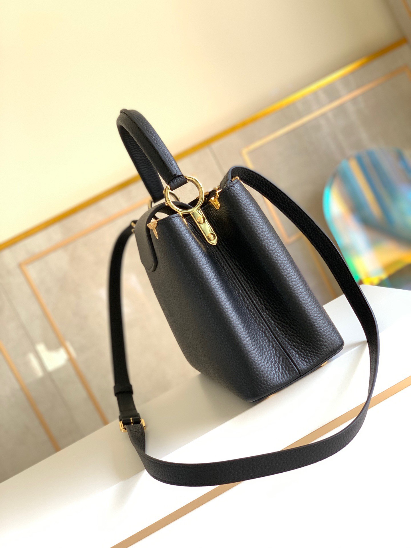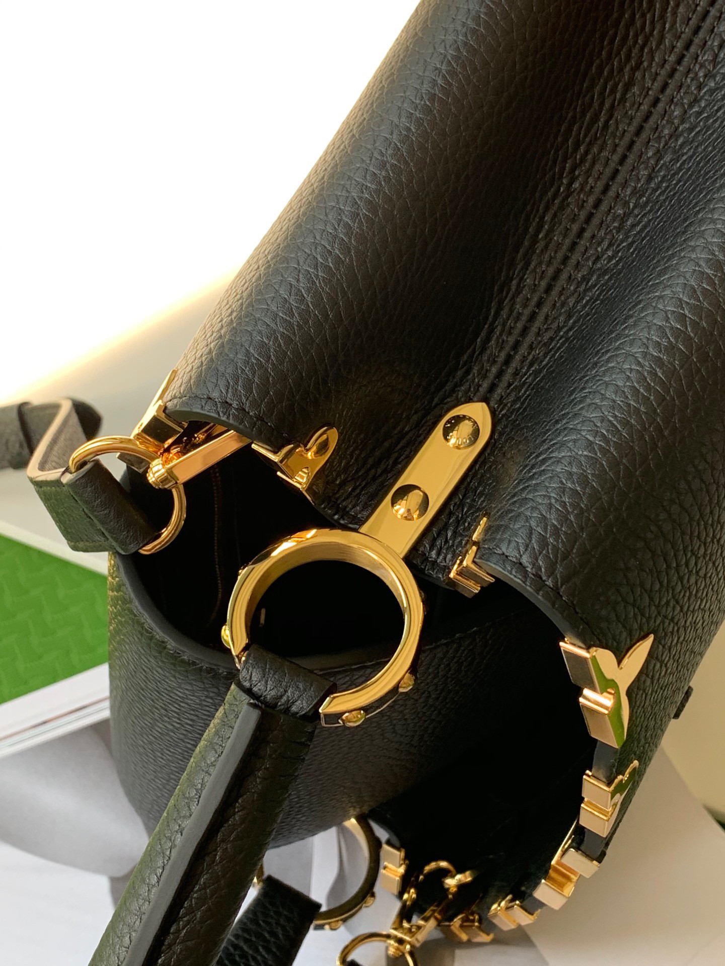 This season the House tells a new Capucines story. Embellished with a delicate frieze of metallic Monogram flowers, the emblematic bag is more feminine than ever. The MM model, in refined Noir with a crown of gold-toned blooms, is both elegant and practical.