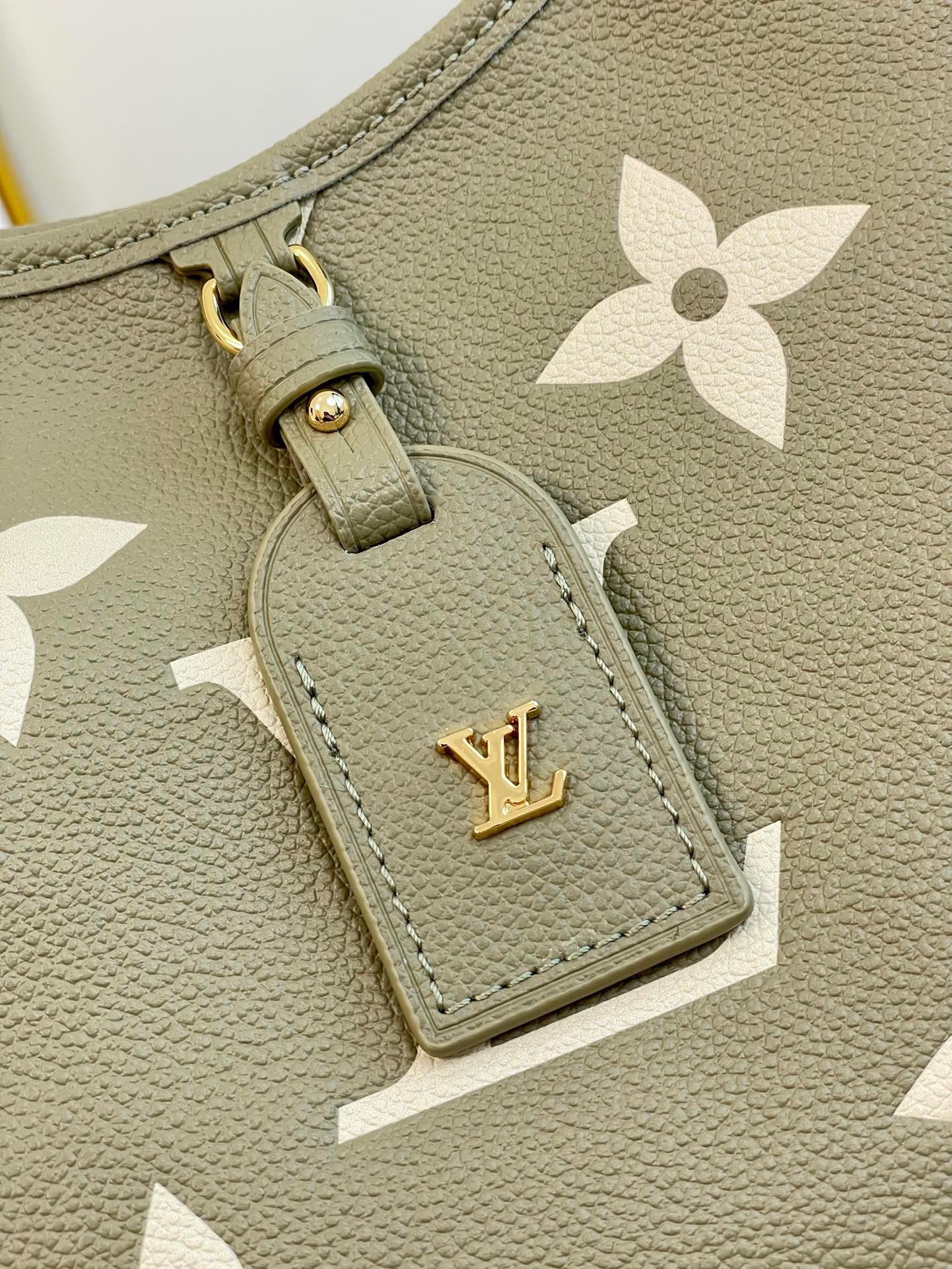 This CarryAll PM bag is fashioned from Monogram Empreinte leather in an earthy bicolor edition. The simple design includes elegant details like a name-tag charm and a leather cord on the zipper. Inside there’s a matching removable pouch, as well as three inside pockets. The leather strap adjusts for hand, shoulder, or cross-body carry.