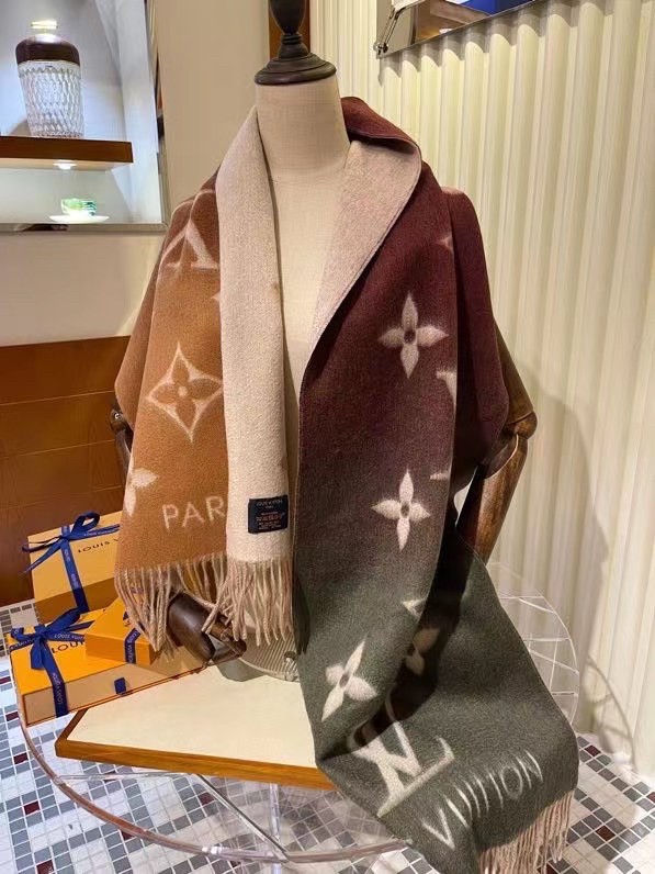 This new version of the Reykjavik Gradient scarf combines an ombré style with oversized Monogram Flowers and LV Initials in a contrasting shade. A bold piece, it is wide and long to protect from winter chills. The soft, hand-dyed yarn makes it an ideal travel accessory.